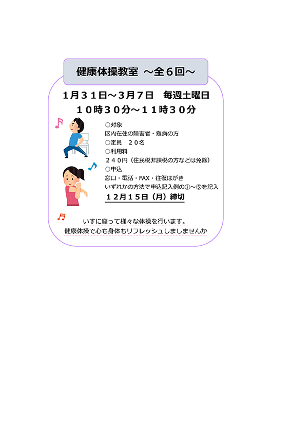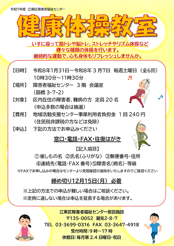 敬心福祉会トップ > 江東区障害者福祉センタートップ > 江東区障害者福祉センターからのお知らせ > 【地活】11月から募集開始の講座・イベントについてお知らせです