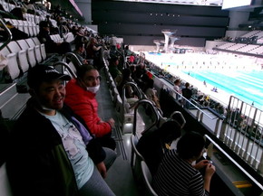 1500m自由形のレースを観戦し、聖火のトーチや公式ウェアを見た後は歩いてセンターまで帰ってきました。国際大会の雰囲気を味わうことができ、とても貴重な体験でした!