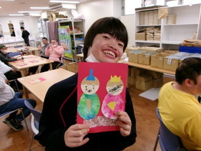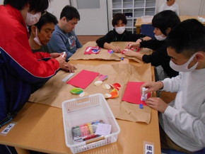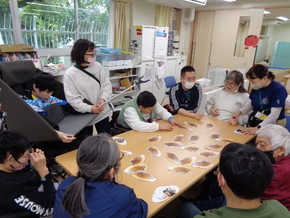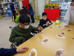 第一作業訓練室では、貝合わせ(神経衰弱のようなゲーム)をしました。貝の写真の裏に利用者さんの写真をはり、同じ写真をそろえるゲーム内容でした。ゲーム後は甘酒をのんでほっと一息ついています。