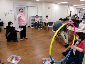 第二作業訓練室では、お内裏様とお雛様の製作とフラフープを的にしてカラーボールを投げるゲームを楽しみました。
